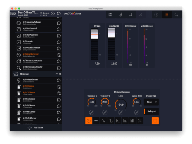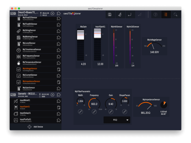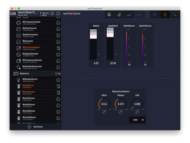 An important feature of AES70 Explorer is the user interface builder. Build a unified user interface, for monitoring or control, directly from devices' OCA object trees.